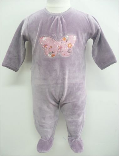 Cute Designer Velour footies easy fit with Floral butterfly imprint soft velour footie with lace trim around the neckline and cuffs butterfly imprint with a floral pattern features a full snap back